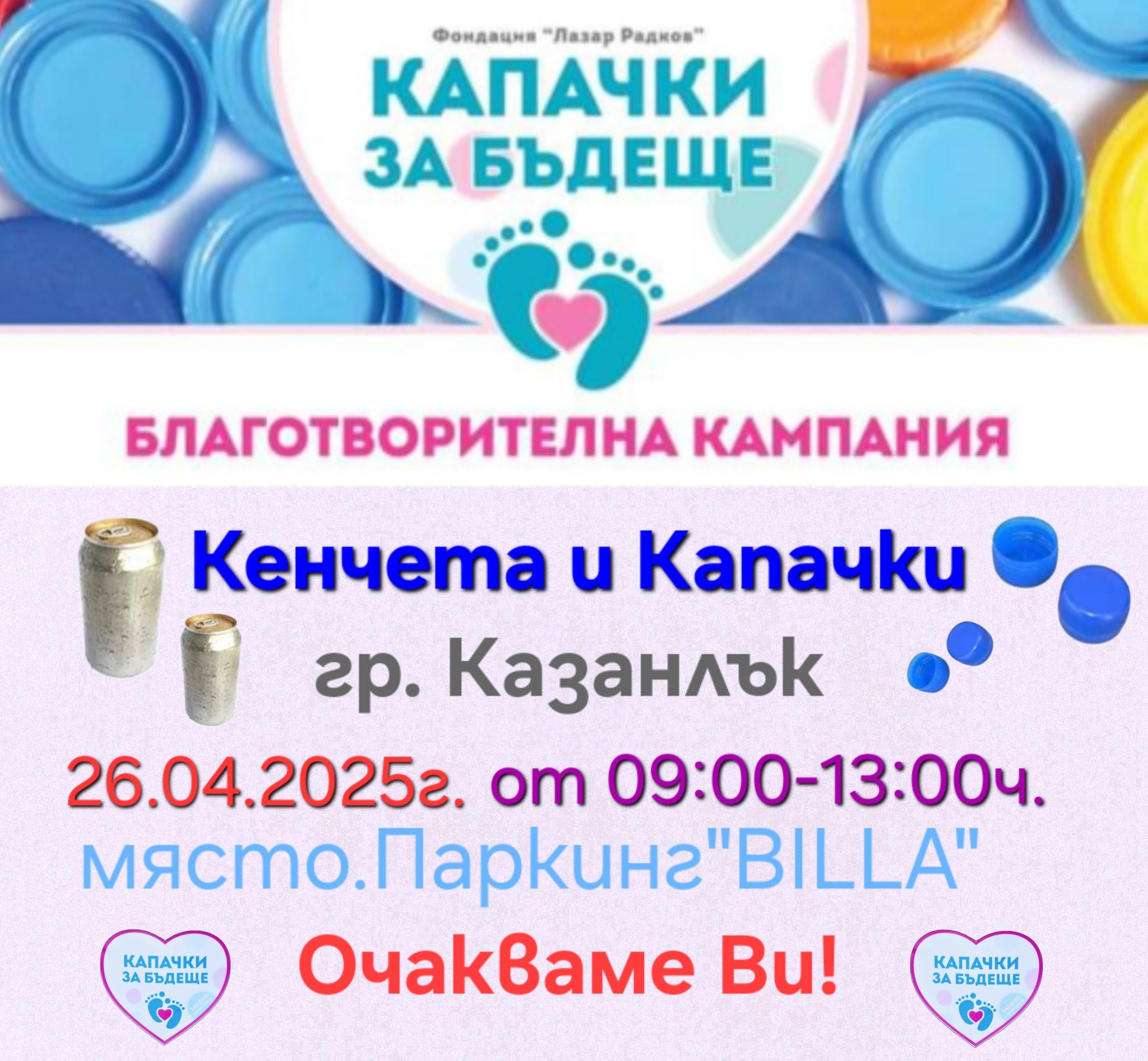 Пролетната кампания на "Капачки за бъдеще" ще се състои на 26-ти април в Казанлък, на паркинга на хипермаркет Billa, в часовете между 9ч. и 13ч. В кампанията ще се събират пластмасови капачки и алуминиеви кенчета.