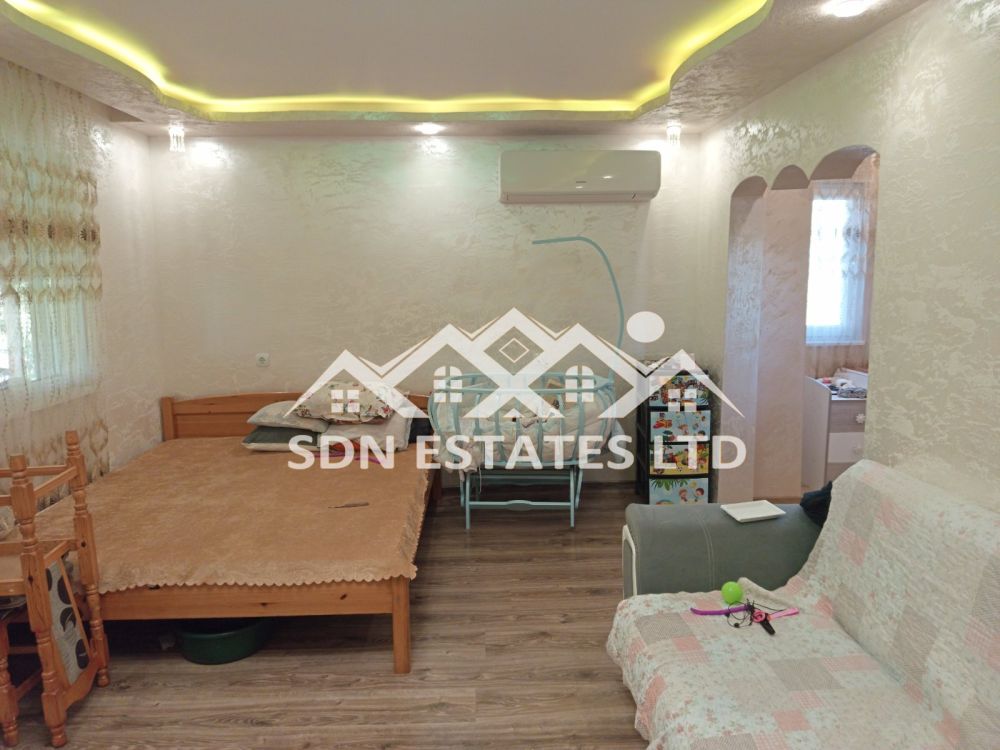 Продава прекрасна къща след освежителен ремонт в гр. Казанлък Имоти Казанлък SDN Estates LTD предлага за продажба къща в град Казанлък, разположена в тих и спокоен район. Имотът е след освежителен ремонт на всички етажи и дава отлична възможност за модернизация според личните Ви предпочитания.Равен двор: 300 кв. м., модерна каменна чешма, поддържана градина: отлични сортове грозде, рози, лалета, божури и др. видове.Къщата е на два етажа:Приземен етаж и втори етаж над него, с цялостно реновиран покрив и с изцяло ново изградена баня и тоалетна /с дограма и PVC врата в нея/, както и нова блиндирана входна врата. ВиК инсталацията на къщата е изцяло подменена с нова, както и част от Ел. Инсталацията.Имотът има и голям гараж подходящ за две коли с площ 30 кв. м. и с предвиден канал.РЗП: 162 кв. м. и следното разпределение:Вторият етаж се състои от кухня с трапезария, две големи спални, баня с тоалетна и коридор. Приземният етаж се състои от две спални, коридор и кухня, като е подходящ за второ семейство, гости, наематели или да бъде обособен във фитнес, офис или ателие. Има прекарани комуникации за баняи тоалетна в помещение непосредствено зад стената на кухнята.Имотът предлага отлична възможност да имате своя мечтан дом и да се отдадете на градинарското си хоби или да се наслаждавате на щастливи моменти със своето семейство покрай барбекюто, хамака, шатрата и батутът за Вашите деца, внуци или гости.Цена: 209 000 лв. / 106 860 евроНе пропускайте тази уникална възможност!Агенцията съдейства за отпускане на банков кредит при преференциални условия.За повече информация заповядайте в офиса на агенцията или на телефон 0878 924 588 и 0878 924 585.