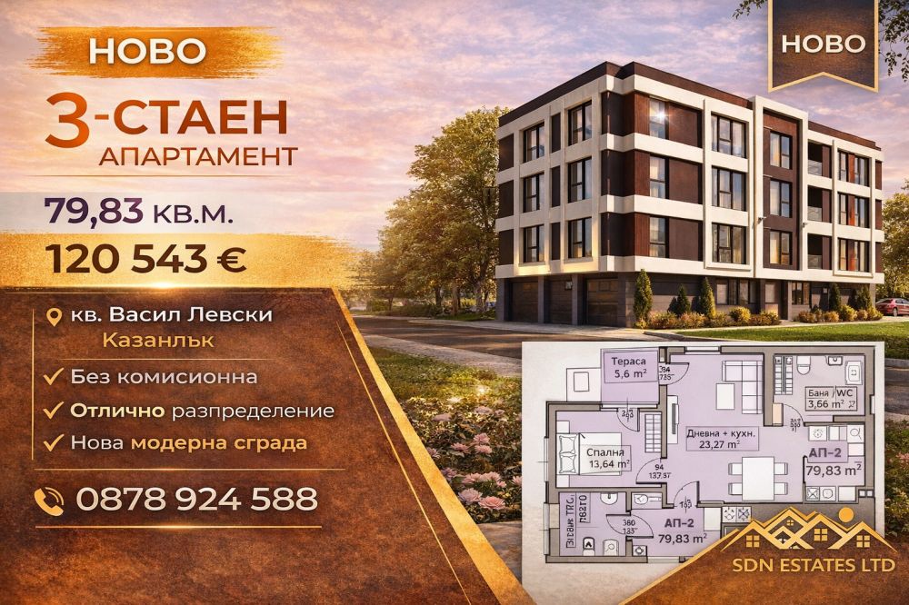 НОВО ПРЕДЛОЖЕНИЕ В КВ. ВАСИЛ ЛЕВСКИ, КАЗАНЛЪК Имоти Казанлък SDN Estates LTD представя за продажба 3-стаен апартамент в нова модерна сграда – отличен избор за семейство или сигурна инвестиция.- 79,83 кв.м.- 120 543 €- кв. Васил Левски, Казанлък- Без комисионна от купувача- Отлично функционално разпределение- Нова сграда с модерна визияИмот с изключително добра цена за площта и локацията.Подходящ както за лично ползване, така и за дългосрочна инвестиция.Агенцията съдейства за банково кредитиране при преференциални условия.Огледи се организират в удобно за клиента време.За повече информация и оглед:0878 924 5880878 924 585www.sdnestate.comSDN Estates LTD Вашият доверен партньор в недвижимите имоти в Казанлък.