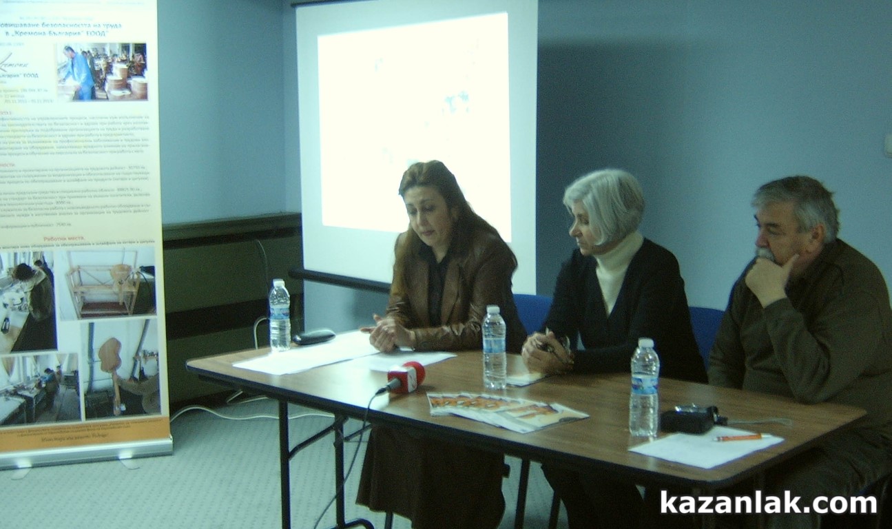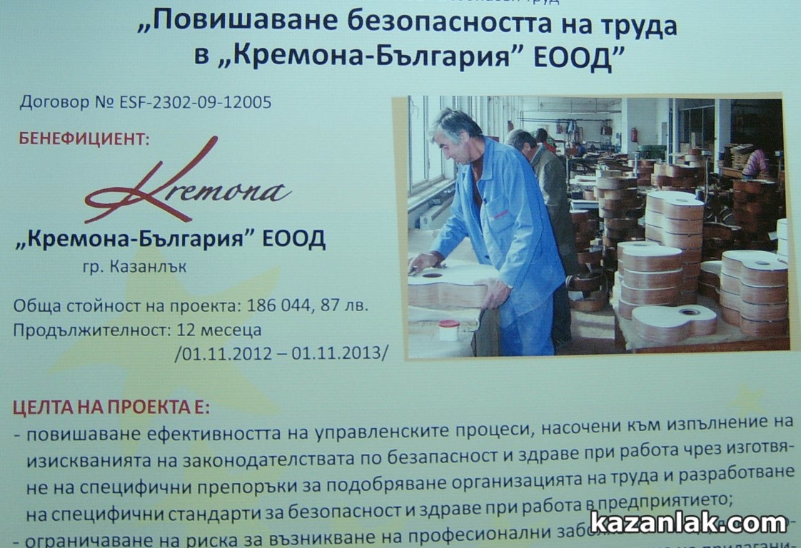 Повод за пресконференцията бе работата на Кремона по еврофинансиран проект за повишаване безопасността на труд и здравословни условия във фирмата. 120 са работниците на Кремона в момента, като част от тях са казанлъчани, а други – от околни населени места, които пътуват с осигурен фирмен транспорт. 15 от кадрите на Кремона – Казанлък „чиракуват” в лютиерското ателие, ръководено от майстора, завършил в Италия - Христо Николов. В това студио на фабриката се произвеждат бутикови инструменти – модели на Страдивари и прецизни копия на известни цигулки на Страдивари.