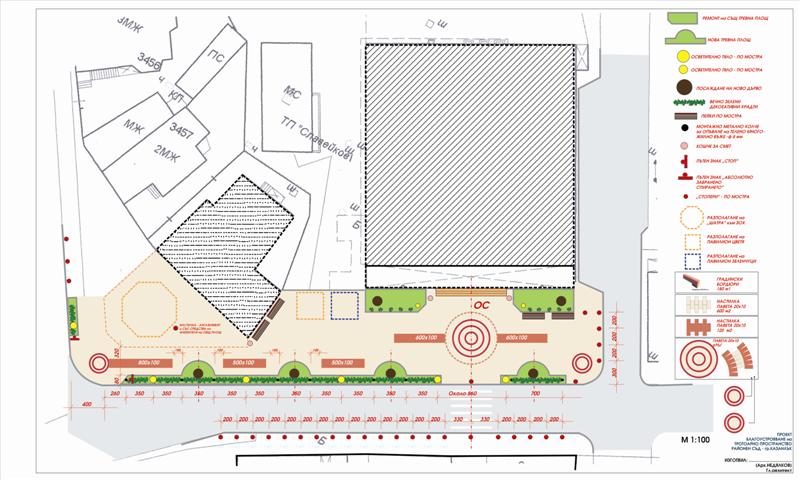 По проект на това място ще бъде оформена тротоарна площ с озеленяване и засаждане на нови дръвчета върху площ от 850 кв.м. Ще бъдат ремонтирани и повдигнати уличните бордюри от южната страна, тротоарът от изток ще бъде редуциран с цел оформяне на място за специализирано паркиране и обслужване на Районния съд от коли на съдебната власт и прокуратурата. Ще бъдат монтирани паркови конструкции за създаване на ограничители от жив плет. Ще бъдат оформени места за почивка и ще се засадят ефектни декоративни дървесни видове. Специално локално осветление ще допринесе за привлекателния изглед на мястото.