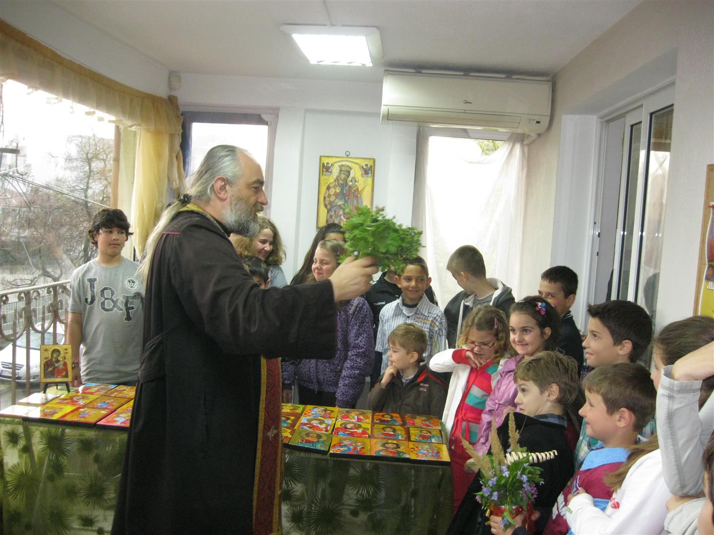 За светите изображения, създадени от малките зографи на школа "Арт линия " бе извършен водосвет от отец Константин, с пожелание за вяра в доброто. Той обясни на децата,ч е рисуваните от техните ръчички икони и светата благословия върху тях ги прави много силни, така всяко дете занесе своята икона у дома, за молитва и подкрепа на семейството си.