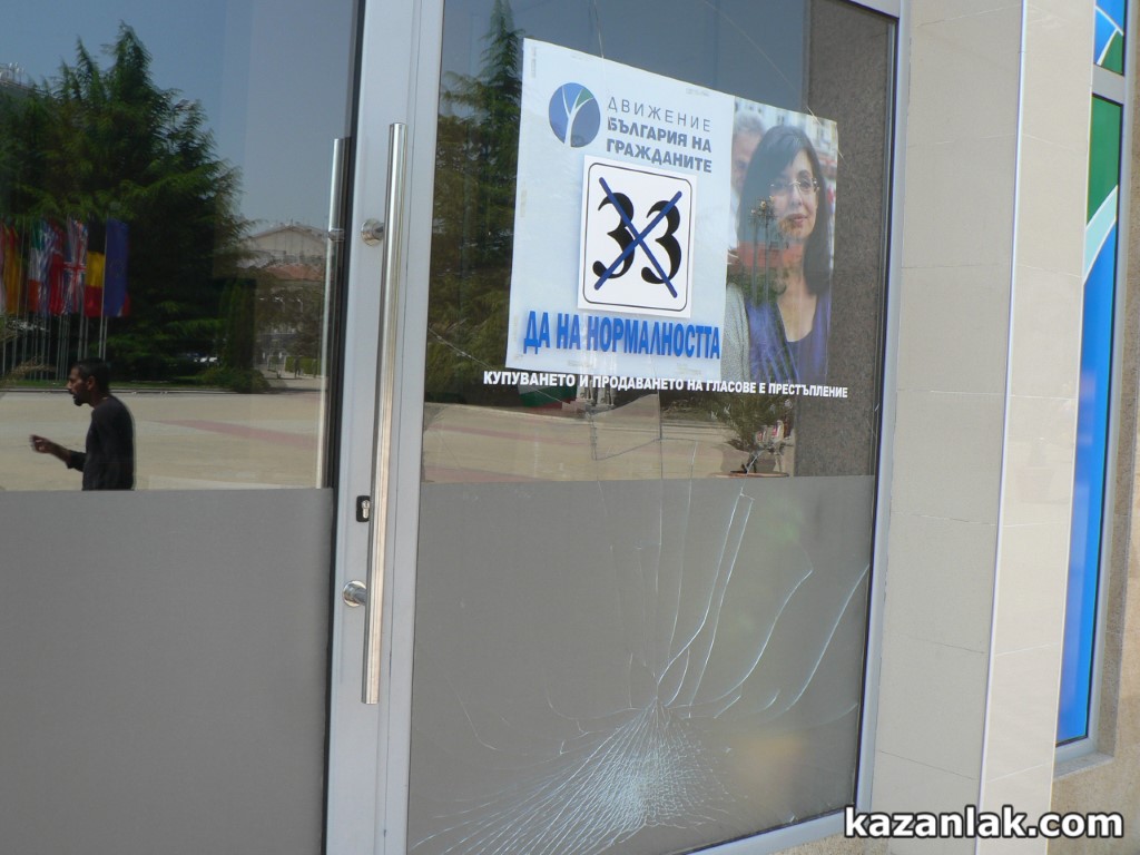 Стъклата на предизборния щаб на Партия Движение България на гражданите, който се намира на най-централното място в Казанлък – на самия площад Севтополис са били счупени снощи. По всичко личи, че стъклото е ритнато с крак, тъй като пукнатината е ниско долу. Матиращото фолио, с което е облепени стъклото изглежда го е запазило от разтрошаване.