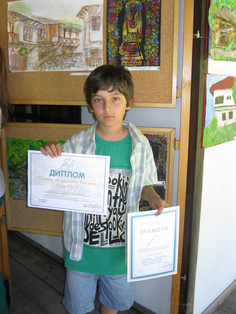Наградата за индивидуално постижение от тазгодишния конкурс "Етър 2013" бе присъдена на 12 годишния представител на казанлъшката Школа „Артлиния“ -Кирил Казаров .