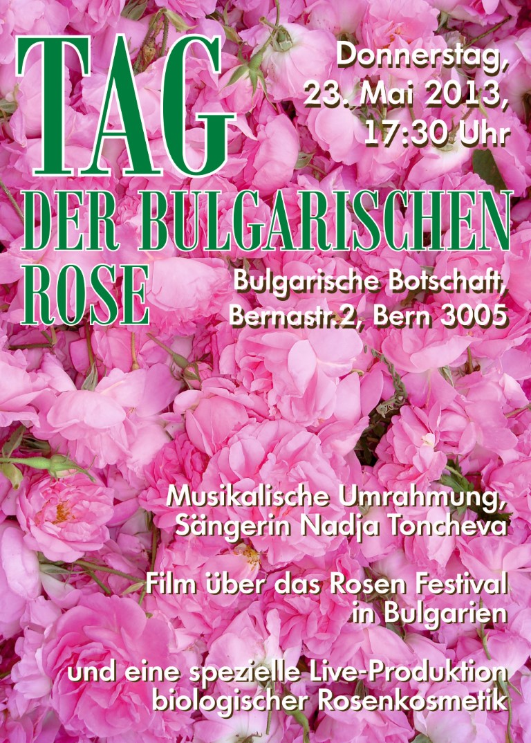Денят на българската роза в Берн е на 23 май вечерта и ще премине с представяне на филма за Долината на розите и тракийските царе, с демонстрация на приготвянето на козметични продукти на основата на розово масло от представител на казанлъшка фирма и изпълнения на поп певицата от нашия град Надя Тончева.
