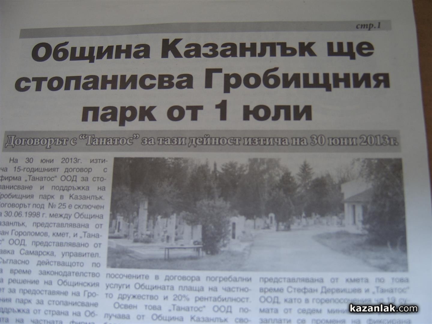 На 30 юни 2013 г. изтича 15-годишният договор с фирма „Танатос"ООД за стопанисване и поддръжка на Гробищния парк в Казанлък. Договорът под N 25 е сключен на 30.06.1998 г. между Община Казанлък, представлявана от Иван Гороломов, кмет и „Танатос"ООД, представлявано от Славка Самарска, управител.