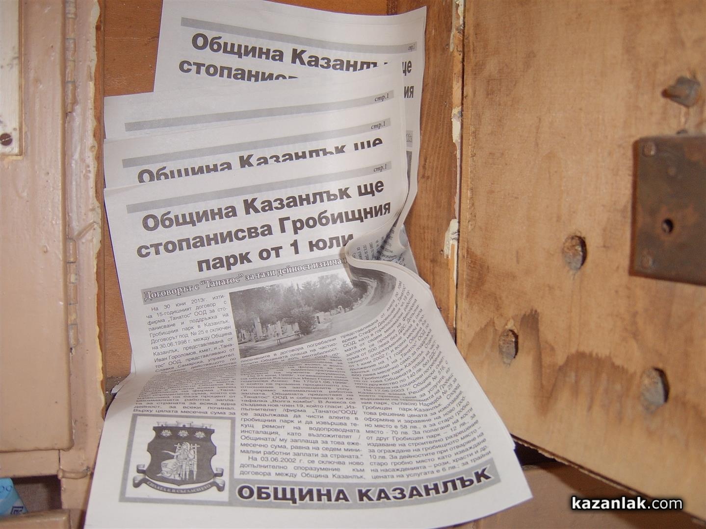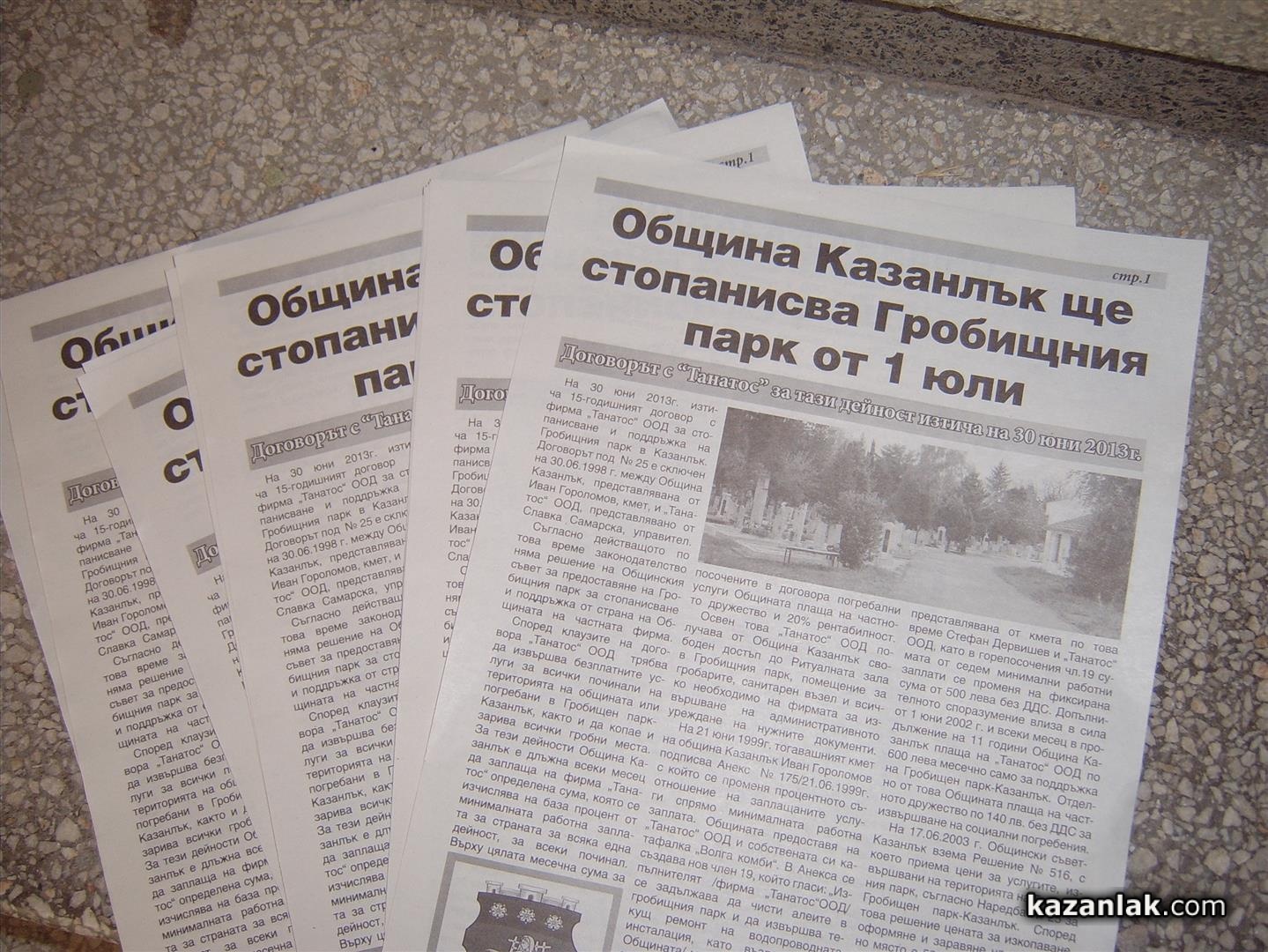 Със специална брошура, отпечатана двустранно на вестникарска хартия и разпространена в пощенските кутии на казанлъчани, вчера, Община Казанлък информира за настъпващите на 1 юли промени в собствеността на Гробищния парк в Казанлък.