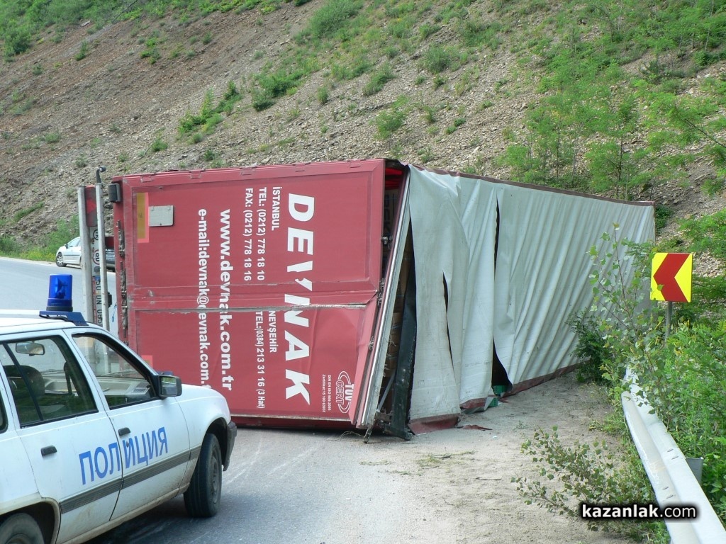 Днес на около 10 километра северно от Гурково, на „Прохода на Републиката“ в посока юг-север се е движил тежкотоварен автомобил „Мерцедес”, управляван от 52-годишен турски гражданин. Поради движение с несъобразена скорост водачът на камиона е загубил контрол над возилото и се удря странично в движещия се насреща товарен автомобил „Скания”. Другият камион също е бил управляван от турски гражданин. След катастрофата "Мерцедесът" продължава движението си удря се в стълб на ел. мрежата и спира в крайпътна канавка.