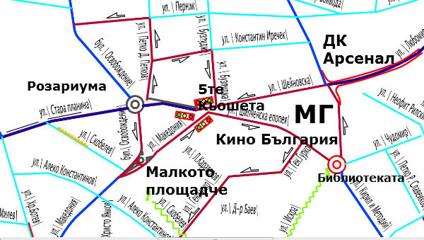 -По ул. „Македония” – от ул. „Ген. Скобелев” до ул. „Шейновска” – привеждане към еднопосочно движение с посока на движение на ППС ЮГ- СЕВЕР / улицата става ИЗХОД/.