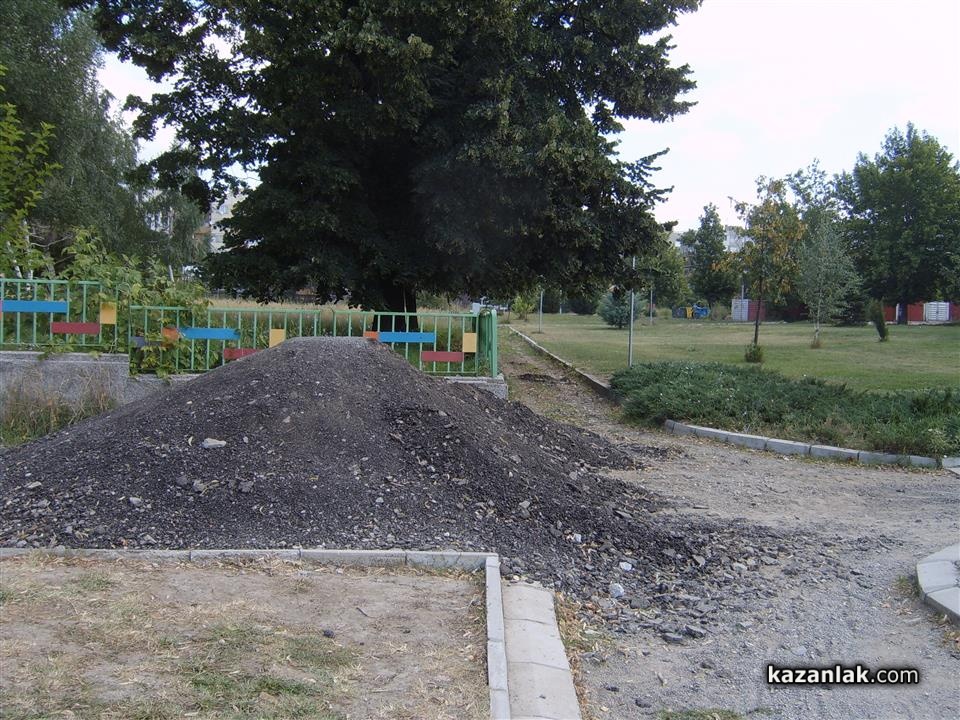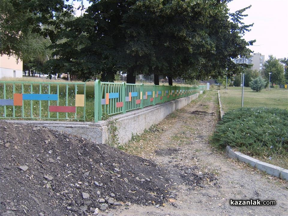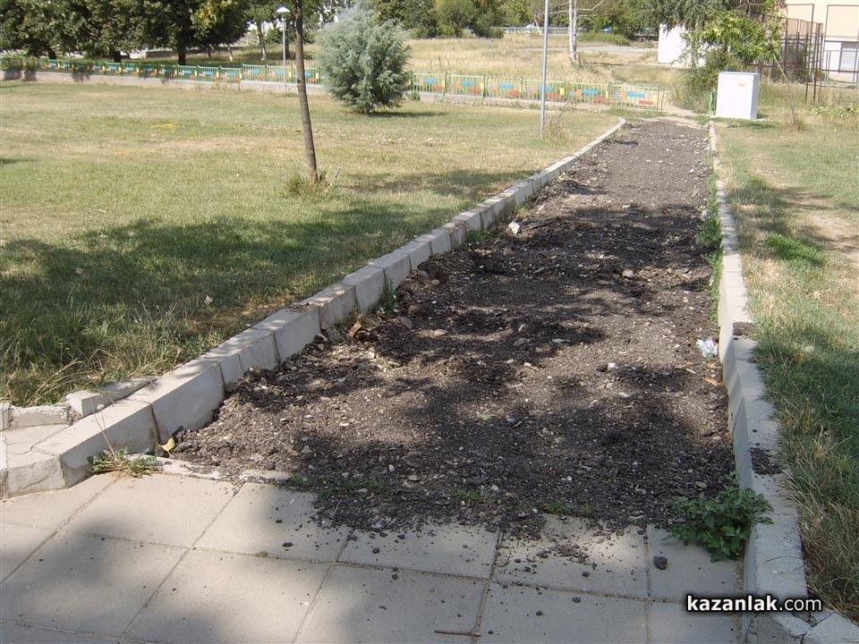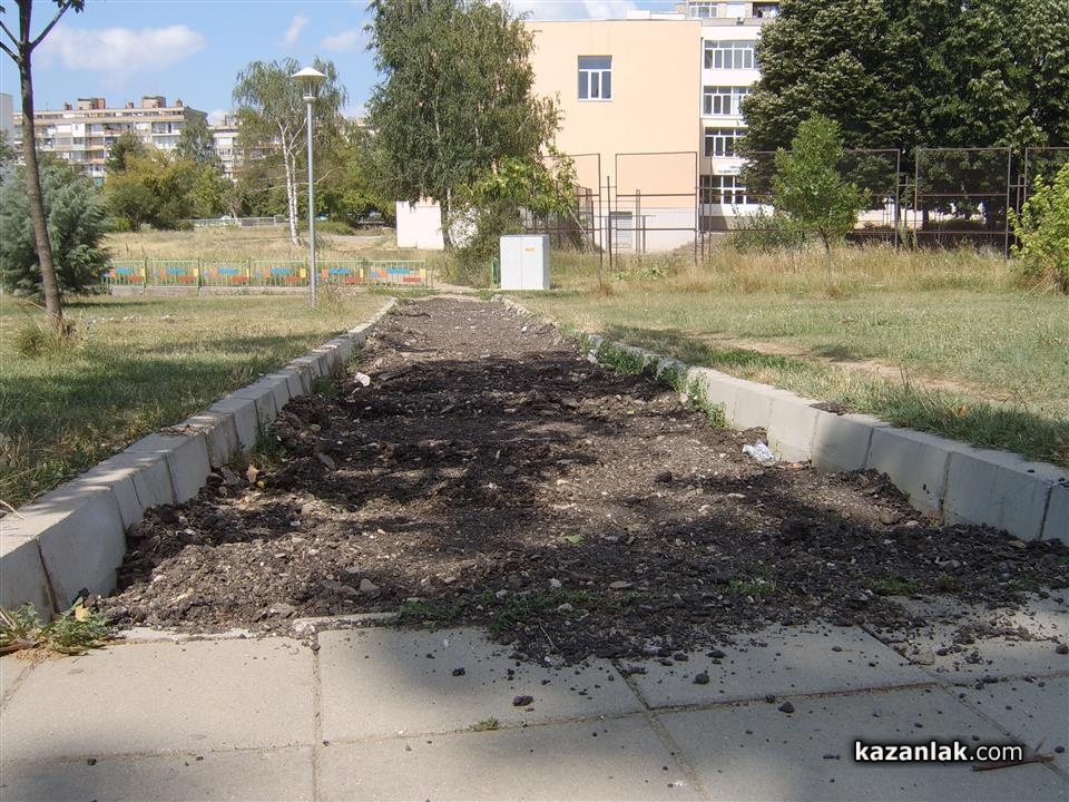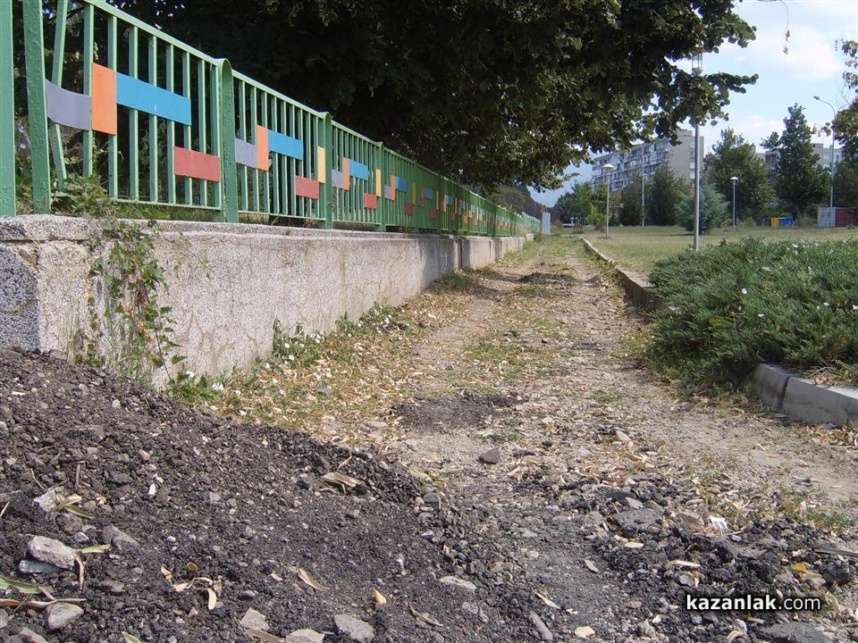 Покрай оградата на училище Никола Вапцаров и перпендикулярна на нея има две алеи, които строителите на парка преди 6-7 години бяха оставили без настилка – на пръст и камъни. Наскоро дори, потребителка на Kazanlak.Com се оплака в репорТИ за опасностите, дебнещи по тези две алеи.