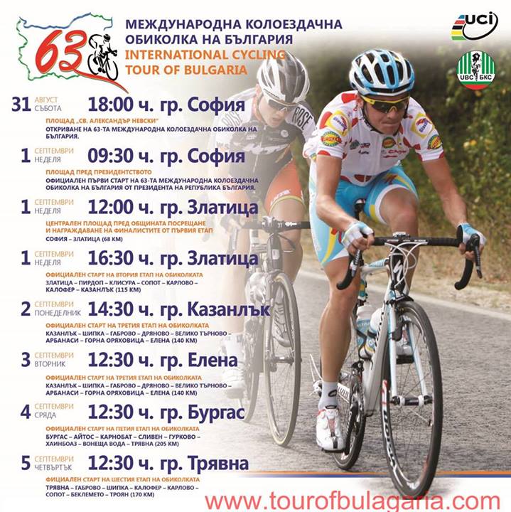 Официалният сайт на 63-та Международна колоездачна обиколка на България обяви етапите в новото издание, което ще стартира след 2 седмици. Както Kazanlak.Com ви информира, в края на месец юли президентът на колоездачния съюз Петър Бончев имаше среща с ръководството на Община Казанлък. Казанлъчанинът, който управлява БКС представи в края на юли новите условия, които Казанлък трябва да изпълни, за да бъде етапен град в Тура на страната ни.