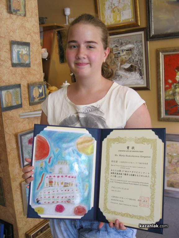 12-годишната Мария Герганова от школата по изобразителни и приложни изкуства „Арт линия“ получи награда от УНИЦЕФ. Младата казанлъшка художничка е възпитаник на Ваня Запрянова и още преди месец бе уведомена, че е сред номинираните участници в световен конкурс. Мария участва в 17-то издание на "Международно биенале на детската рисунка", в град Канагава, Япония.
