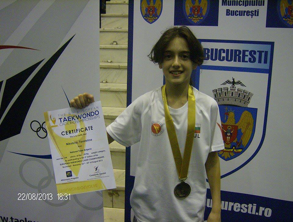 Страхотен успех постигна казанлъшката състезателка по таекуондо Цветелина Николова. Състезателката на клуб Кентавър спечели първото място на Европейското първенство за кадети в категория до 29 килограма /клас А - с разрешени удари в областта на главата/.