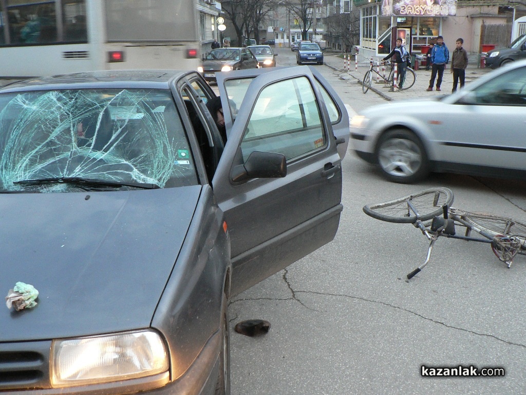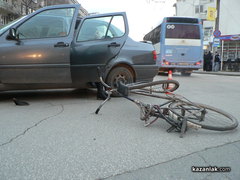 Велосипедист бе откаран в казанлъшкия Спешен център, след катастрофа на кръстовището на ул. „Хаджи Димитър“ и бул. „Александър Батенберг“. Около 17.00 часа днес Фолксваген Венто управляван от 31-годишна жена блъска велосипедист. Засега няма данни за състоянието на пострадалия мъж, но по данни на свидетели той не е пострадал сериозно.