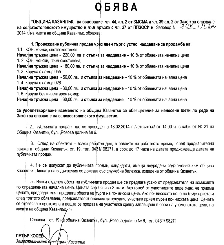 В търга нямат право да участват лица, които имат неуредени задължения към Община Казанлък. Животните и каруците са конфискувани от Община Казанлък за удовлетворяване вземанията на институцията, като обезщетения за нанесени щети по реда на Закон за опазване на селскостопанското имущество.