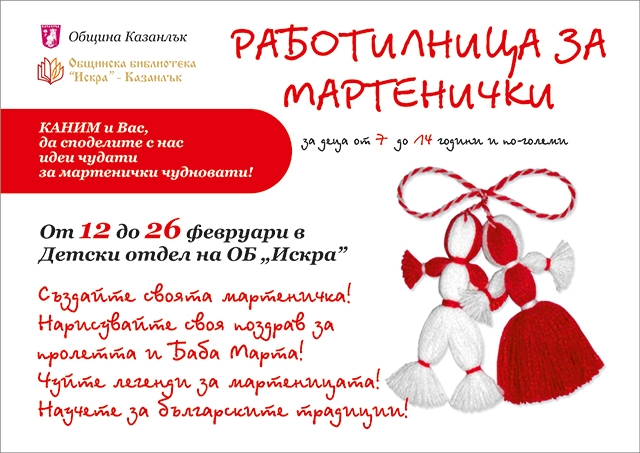 Традиционната за библиотека Искра инициатива стартира на 12 февруари. До 26 февруари децата от Казанлък ще вложат своето творчество и старание, за да изработят с любов най-красивите мартенчики за своите родители и приятели.