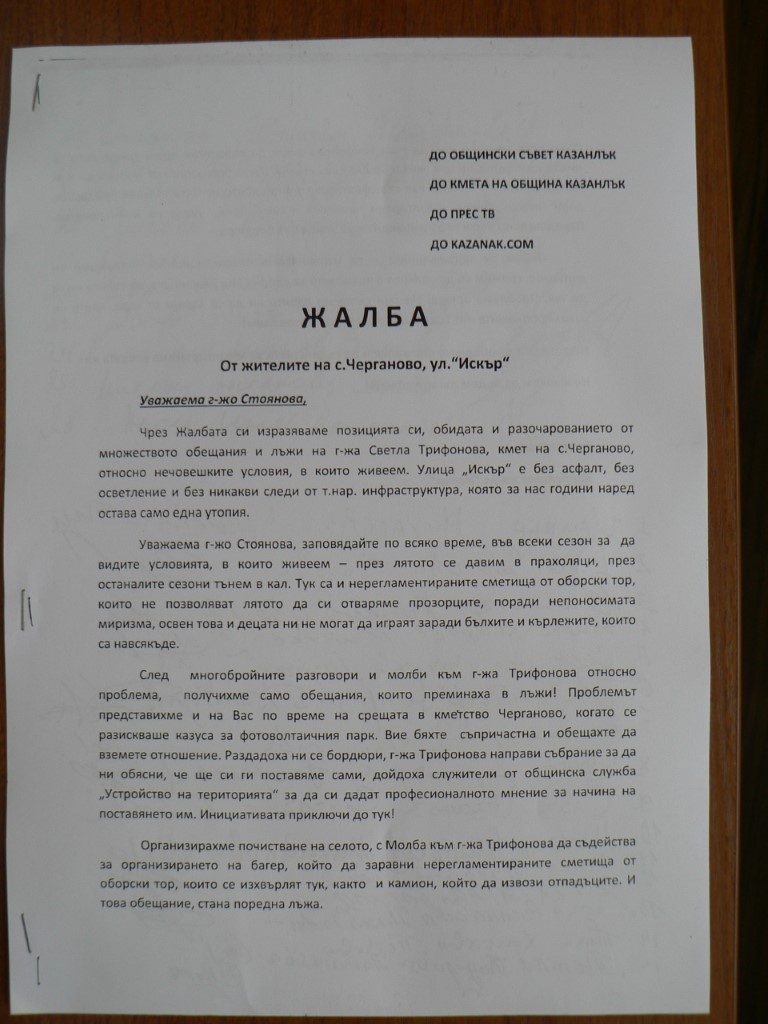 Чрез Жалбата си изразяваме позицията си, обидата и разочарованието от множеството обещания и лъжи на г-жа Светла Трифонова, кмет на с.Черганово, относно нечовешките условия, в които живеем. Улица ,,Искър" е без асфалт, без осветление и без никакви следи от т.нар. инфраструктура, която за нас години наред остава само една утопия.