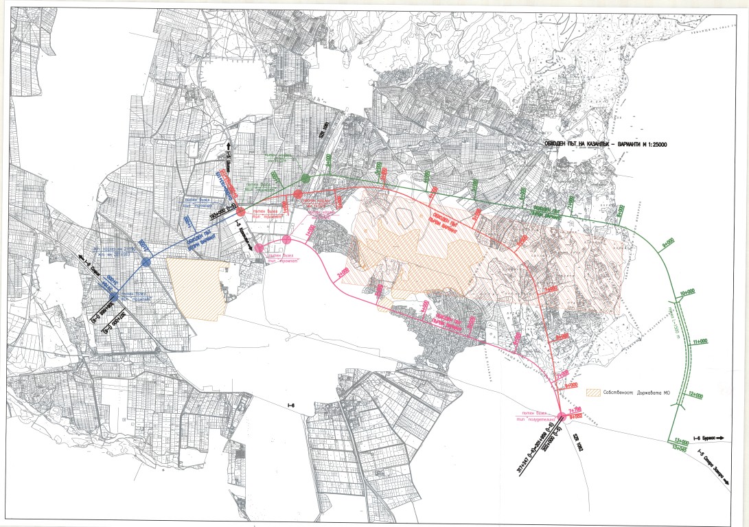 На снимките са представени в съответните цветове вариантите на идейния проект за обходен път на Казанлък.