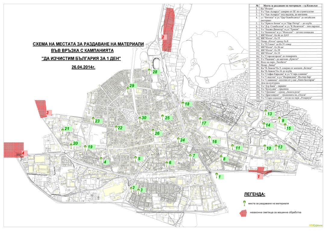 В деня на почистването, 26 април 2014 г., на територията на град Казанлък ще бъдат организирани 30 пункта за раздаване на чували и ръкавици, а за другите населени места пунктовете се организират от кметовете на населените места и кметските наместници.