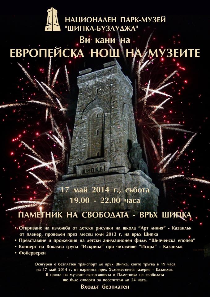 Ново тази година е мащабното събитие, което организират от Национален парк-музей Шипка Бузлуджа. Нощта на музеите на Паметника на Свободата на връх Шипка ще завърши с фойерверки. Постоянната експозиция на Паметника на Свободата на връх Шипка ще бъде отворена за безплатно посещение от 19:00 до 24:00
