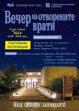 По същото време, вратите си за безплатни посещения отварят Исторически Музей "Искра" и Художествена Галерия Казанлък. От 18:00 до 24:00 гражданите ще мигат да разгледат свободно постоянните експозиции - тракийско, антично, наследство, Възрожденски носии и накити, оръжия и находки от Освобождението, казанлъшка промишленост от началото на миналия век и др.