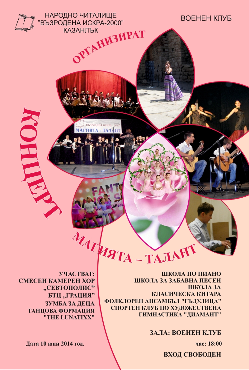 НЧ „Възродена искра – 2000” и Военен клуб - Казанлък на 10 юни от 18.00 часа организират концерт „Магията – талант” на сцената на Военен клуб.