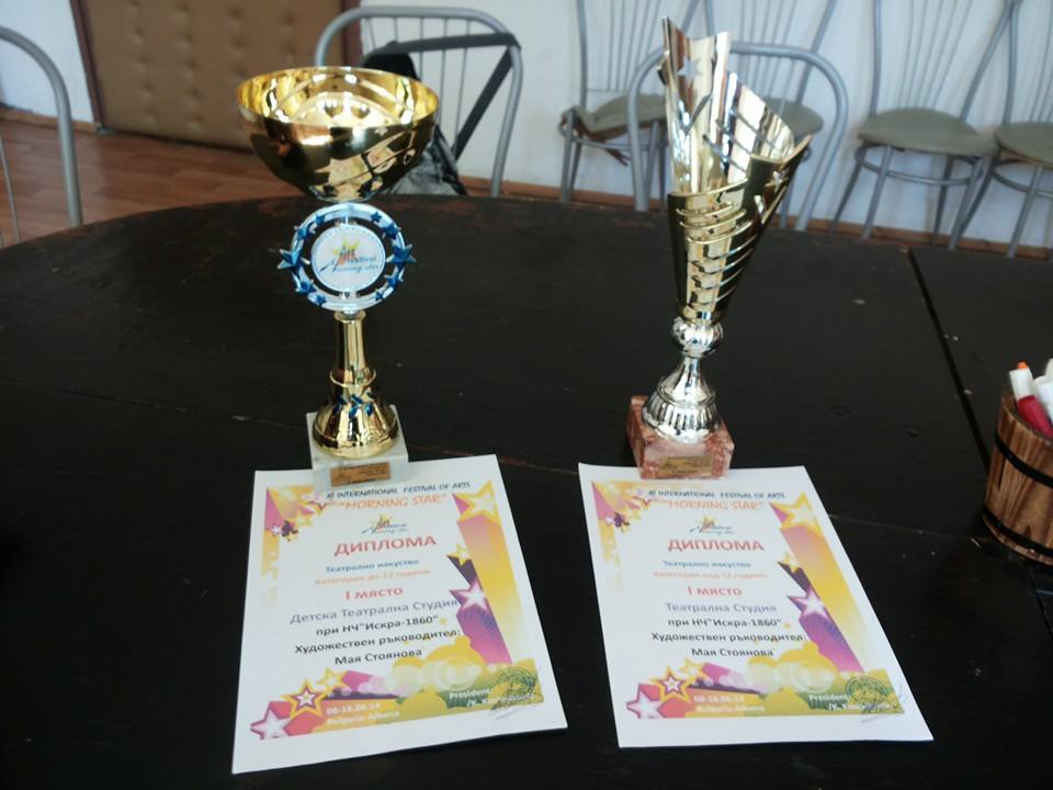 Днес в НЧ „Искра“ пристигнаха награди от Международния фестивал на изкуствата „Утринна звезда - Албена 2014“. Това бе 11-то издание на фестивала, като за първи път в него участваха Детската и Младежката театрални студии при НЧ „Искра“ с ръководител Мая Стоянова. Двете студии участваха в надпревара с 12 колектива от Украйна, Молдова, Румъния, Унгария и България. Във възрастовата група до 12 години Детската студия спечели първото място със спектакъла „Цветята на малката Ида“. Общо в постановката участваха 13 казанлъшки деца. За първи път журито присъди и индивидуални награди, като две от тях пристигнаха в града на розите. Мартин Янков и Атина Петрова получиха призове за ролите си: момчето и Ида в детския спектакъл. Казанлъчани впечатлиха журито и със танците в спектакъла, като бяха поканени да представят един от танците на открита сцена в Албена, което е признание и за хореографът и треньор по спортни танци – Николай Тенев.
