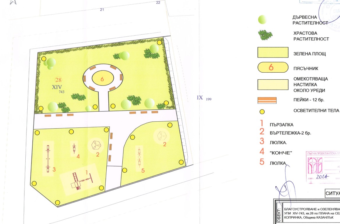 Теренът, който ще се превърне в красив парк, се намира в центъра на с. Копринка. Площта ще бъде подравнена, ще се оформят алеи, ще се изгради пясъчник, ще се монтират осветителни тела, пейки и ще се постави омекотяваща настилка около детските съоръжения – пързалка, въртележки, люлки и конче.Ще се оформят зелени и цветни площи, ще бъдат засадени широколистни и иглолистни дървета и храсти.