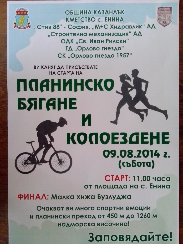 Община Казанлък и кметството на с. Енина, с участието на ТД „Орлово гнездо“, СК „Орлово гнездо 1957“ и съдействието на „М+С Хидравлик“ АД, „Стив 88“-София и „Строителна механизация“ АД, организират планинско бягане и колоездене на 9 август 2014 г. Стартът ще бъде даден утре, събота, в 11.00 часа на площада на с. Енина, а финалът е на малката хижа „Бузлуджа“.