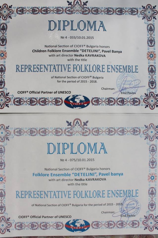 Преди броени дни във Велико Търново ЦИОФФ отново потвърди статута на голямата група на "Детелини" като "Представителна" и връчи диплом със срок на валидност три години. Новото е, че малките танцьори също получиха признание от Международната организация и за пръв път се сдобиха със званието "Представителна група".