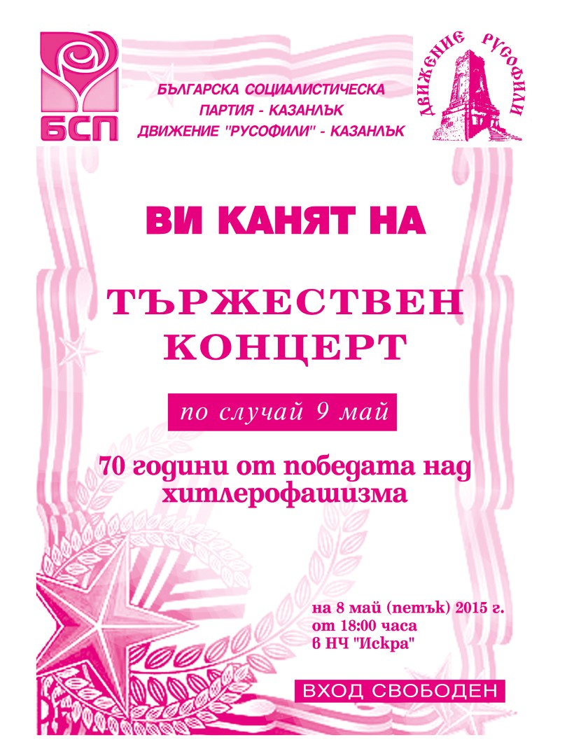 Казанлъчани ще отбележат с празничен концерт 9 май – Денят на победата, съобщиха от Общинския съвет на БСП в Казанлък. Концуртът ще се проведе на 8 май (петък) 2015 г. от 18.00 часа в НЧ „Искра”. Поводът за концерта е отбелязването на 70-та годишнина от победата над хитлерофашизма.