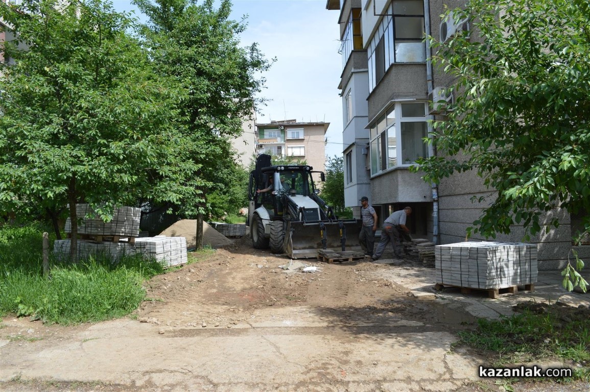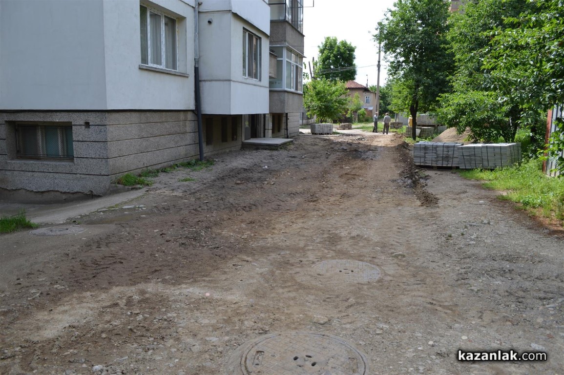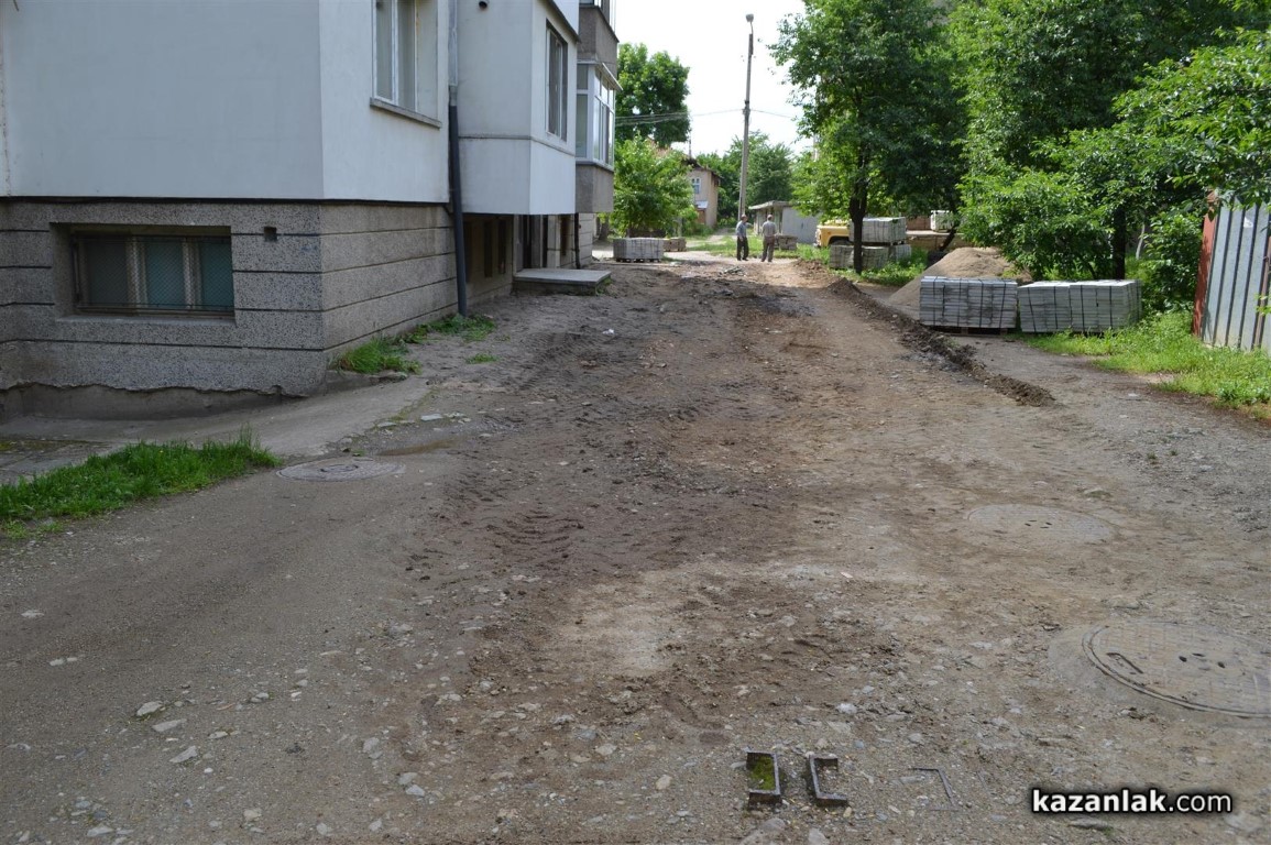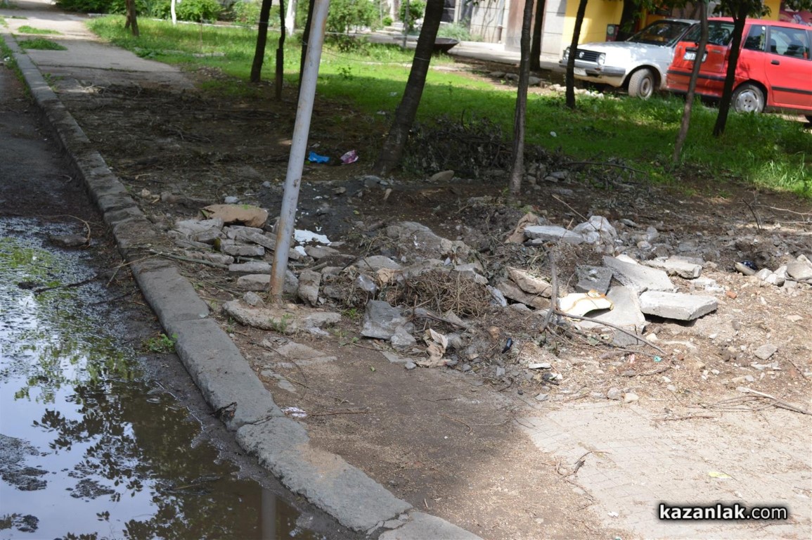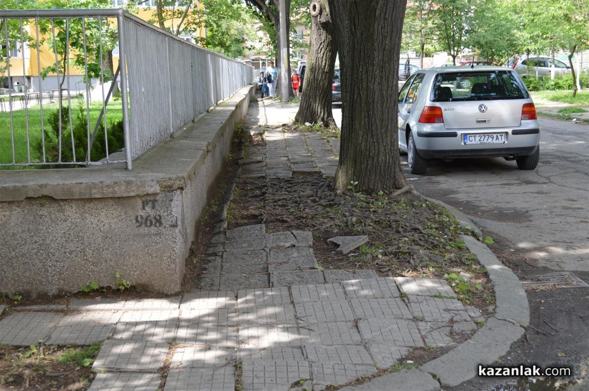 Допълнение1: След над половинчасов разговор с Николай Чалъков по телефона, около 16:00 днес - след като бе направена публикацията, той обясни, че общинската фадрома е наета от живеещите във входа, за което има документи, че хората от входа сами са събрали пари и са си закупили плочките, за което също имали доказателства и ще платят на майстори, които в извън работно време ще сложат тази събота и неделя новите плочки. Разбрахме се в правото си на отговор Община Казанлък да представи документи, които сметне за нужно. И почти получих обещание да се оправи тротоара към училище "Георги Кирков".