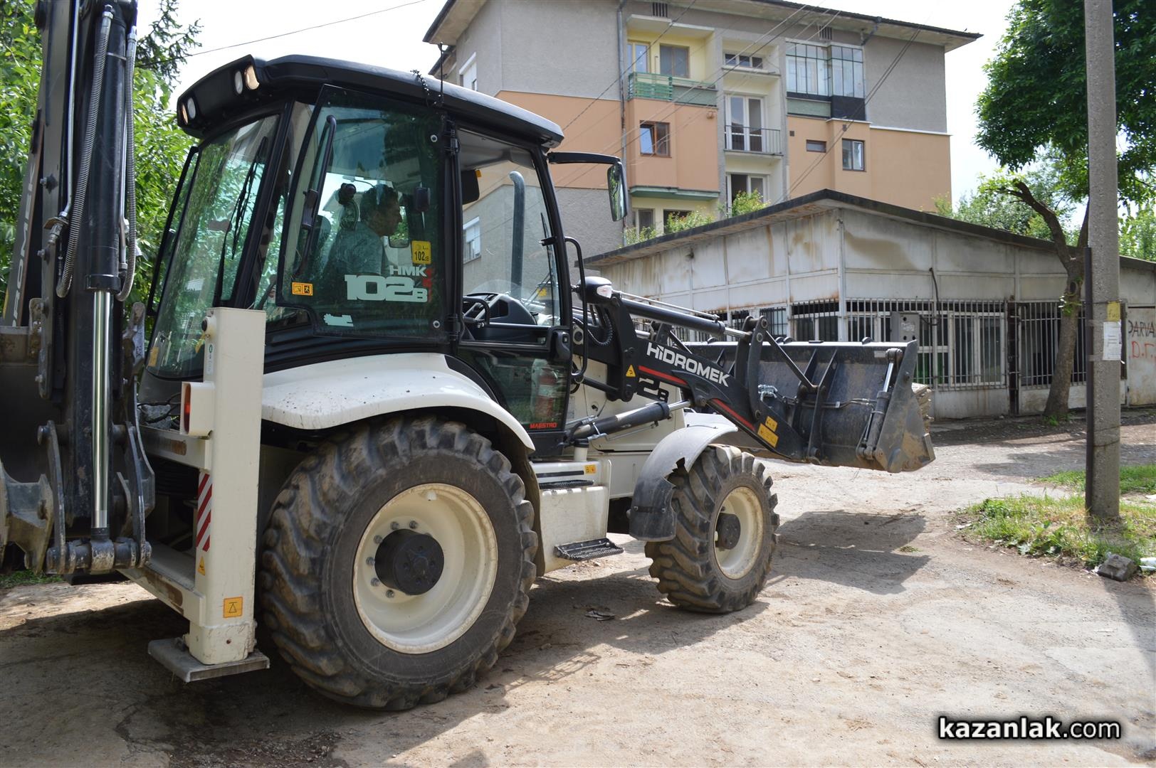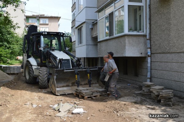 Багерът на общинското звено по строителството заравнява терена пред блок 7Б на улица „Стоян Михайловски”. Съседи побързаха да разпитат какво става и научили от общинските работници, че офанзивата по полагане на чисто нови плочки с общински пари щяла да продължи и в събота и неделя.