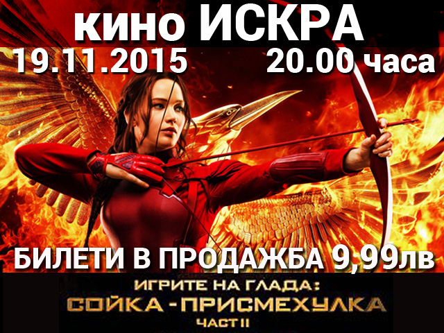 Билети за предпремиерата на "Игрите на глада: Сойка-присмехулка част II" може да закупите в Кино „Искра“. Прожекцията е на 19 ноември от 20.00 часа.