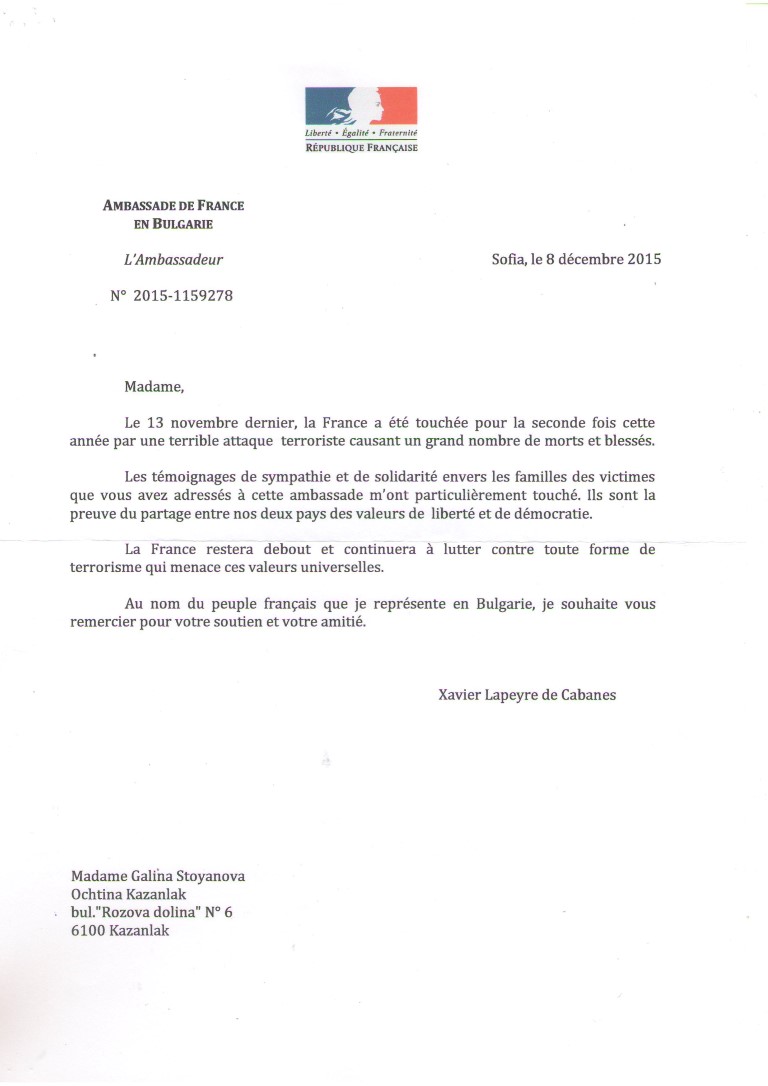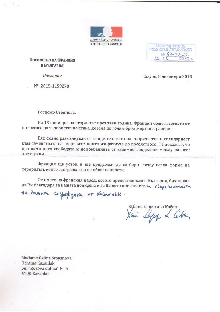 Негово превъзходителство Ксавие Лапер дьо Кабан изпрати адрес до кмета Галина Стоянова, за да благодари на гражданите на Казанлък за проявената съпричастност към френския народ, след атентатите в Париж от 13 ноември 2015 година.
