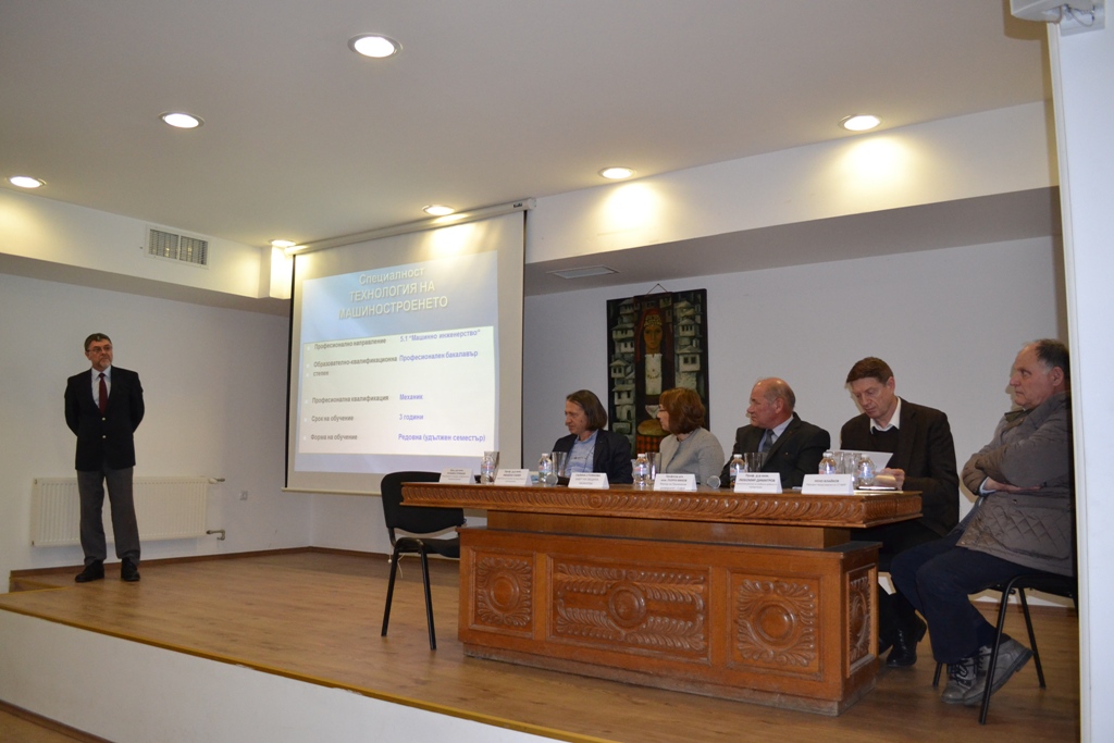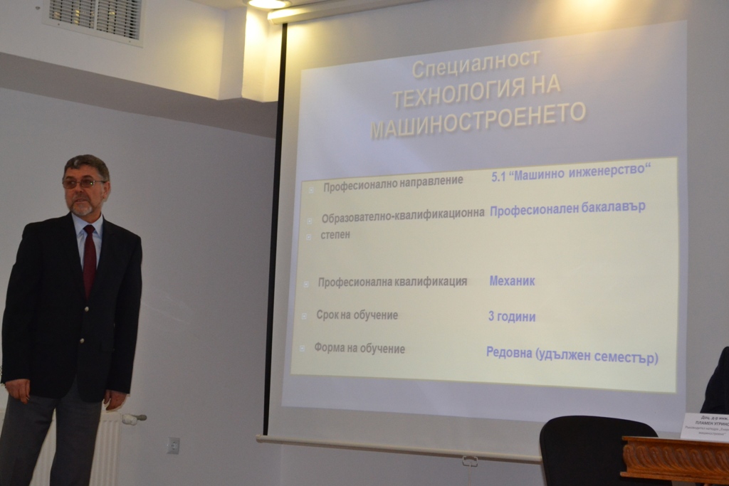 Доц, д-р инж. Пламен Угринов представи пред работодателите примерна програма, по която ще се обучават студентите. Учебният план на специалността Технология на машиностроенето, включва тригодишно обучение (или 6 семестъра). Общите дисциплини, предвидени за този срок са 36. Сред тях ще има общоинженерни дисциплини, машиностроене, хидравлика и други.