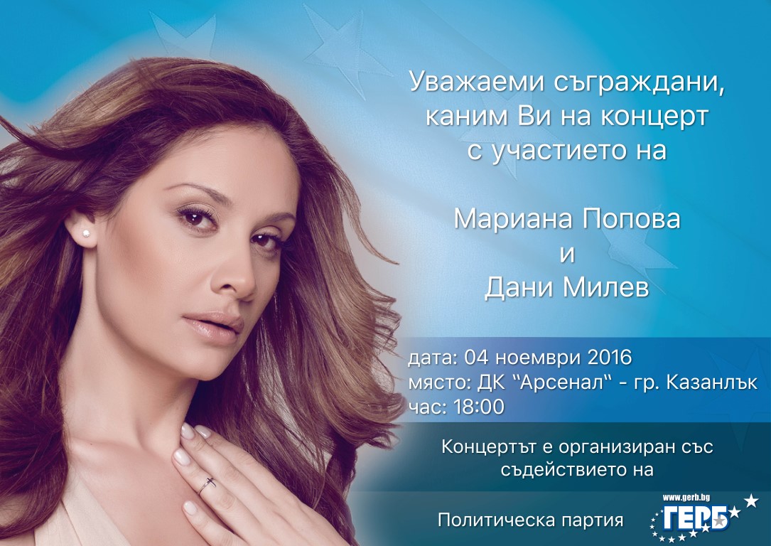 ГЕРБ Казанлък подарява концерт с участието на Мариана Попова и Дани Милев