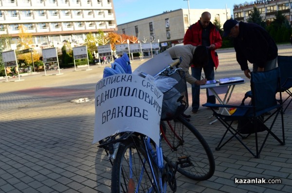Днес в центъра на Казанлък се събираха подписи против еднополовите бракове в Европейския съюз. Хората събиращите подписите съобщиха, че това е Европейска гражданска инициатива за защита на брака и семейството и подписи се събират на територията на целия Европейски съюз.
