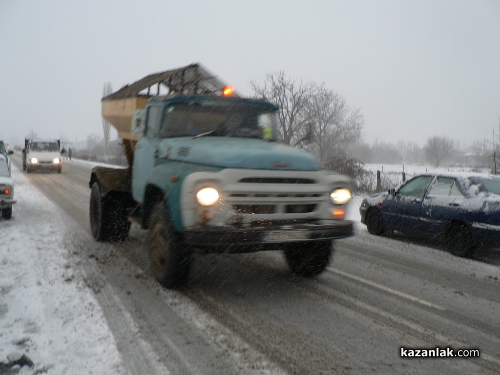 Заради силни снегонавявания и нулева видимост са затворени пътищата Мъглиж-Николаево, Крън-Шипка, Дунавци-Шейново-Шипка, отсечката от надлеза на с. Тулово до надлеза на отбивката за Мъглиж.