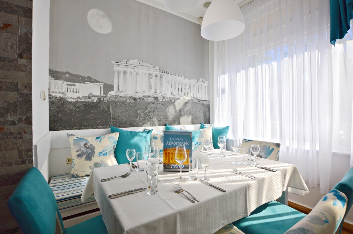 Ресторант "Акрополис " се намира срещу Стадион „Севтоплолис“, ще го познаете по типично гръцкия интериор в бяло и синьо, по гръцката музика и аромата на Средиземноморието!