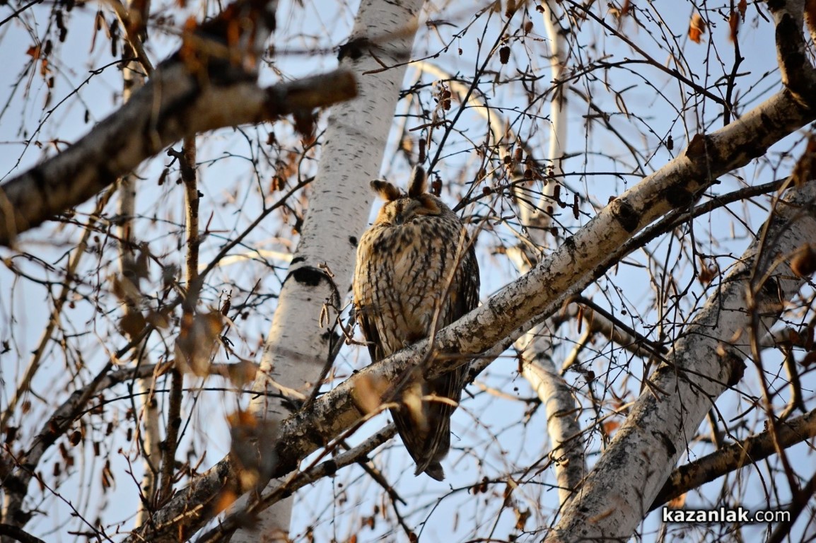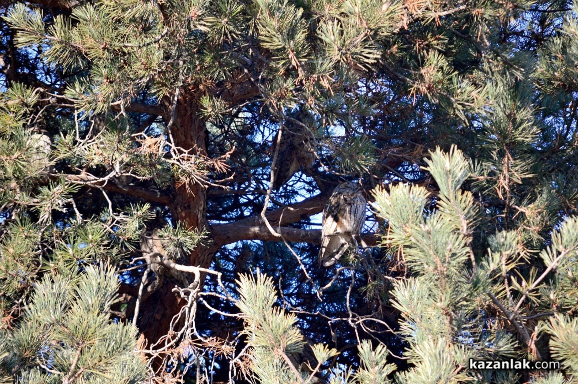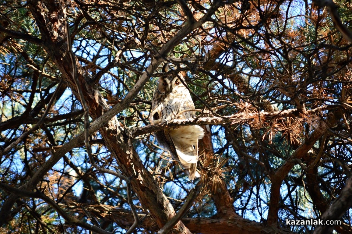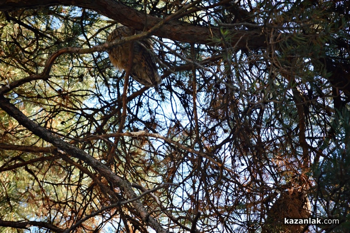 Вече десет години подред, ушати сови долитат всеки декември от гората за да презимуват на клоните на брезите в закътано междублоково пространство в центъра на Казанлък. Днес ги намерихме наказали и по боровете. 5-6 сови са долетели от вчера в кварталната градинка. Жителите на кооперациите на бул „23 ПШП“, северно от Виенската сладкарница, са свикнали с необичайните си гости, които гнездят зимно време на клоните на брезите край блоковете им още от 2007 г. „Имало е години, в които сме преброявали над 17 совички.“ – сподели с kazanlak.com жител на квартала.