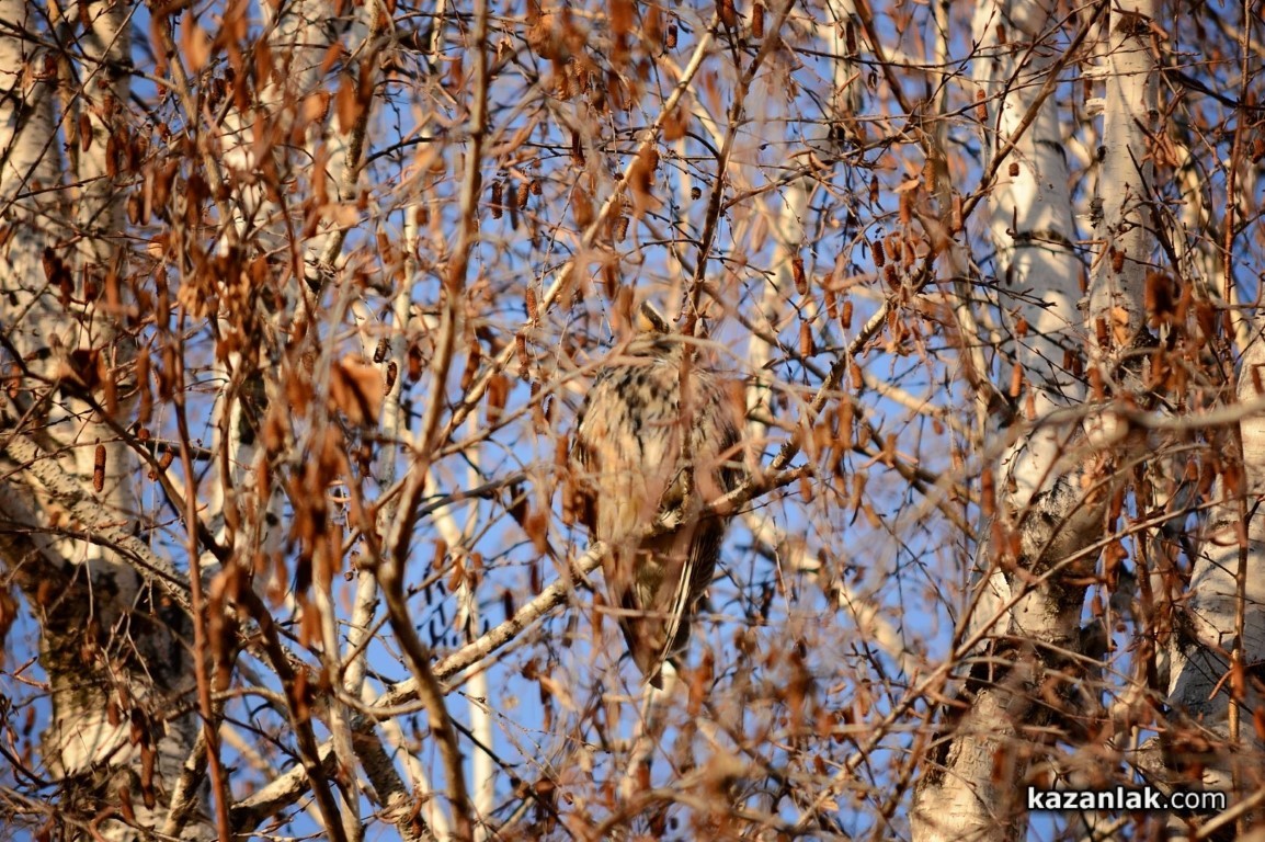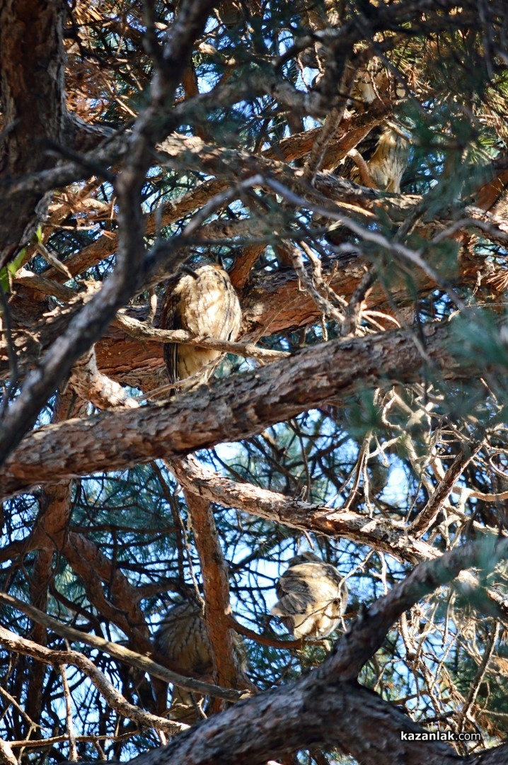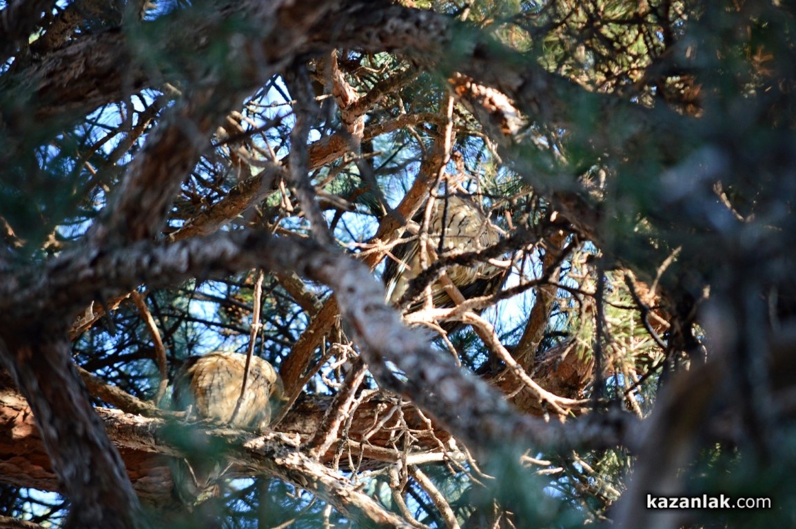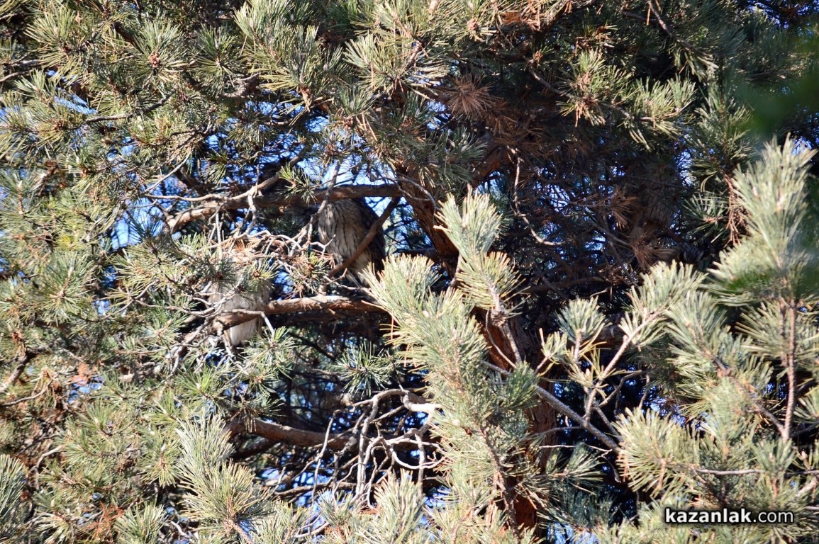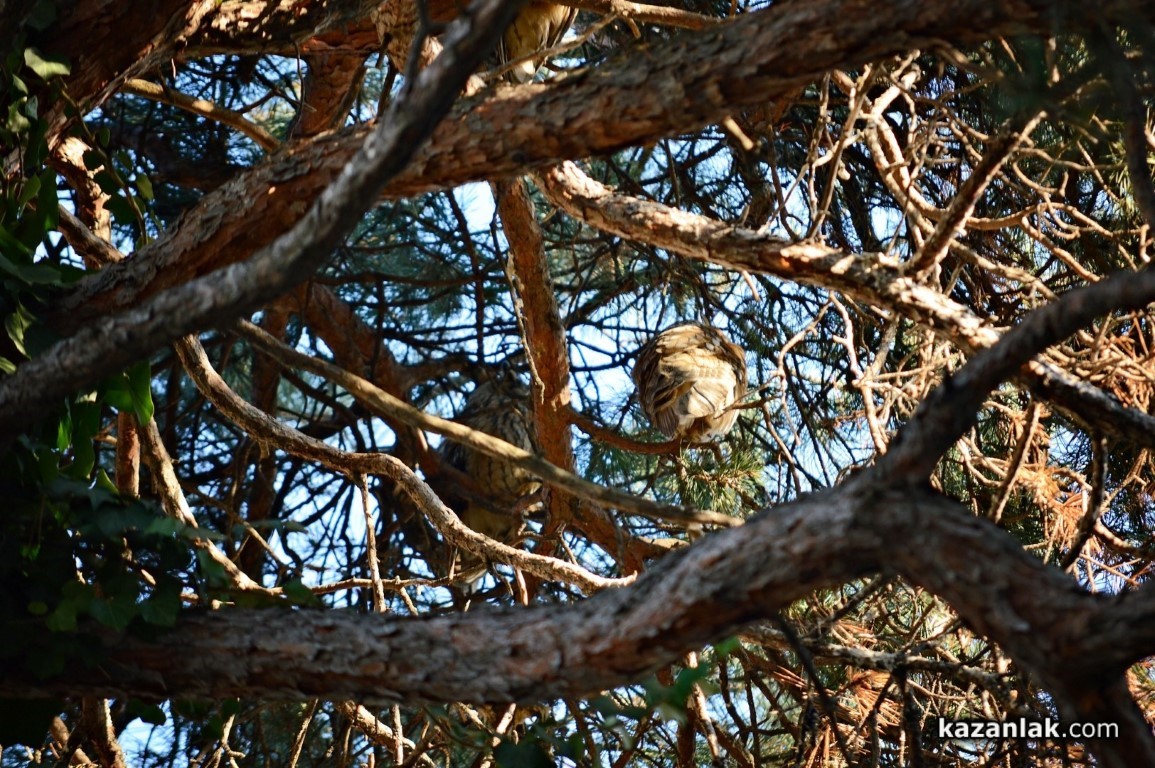Вече десет години подред, ушати сови долитат всеки декември от гората за да презимуват на клоните на брезите в закътано междублоково пространство в центъра на Казанлък. Днес ги намерихме наказали и по боровете. 5-6 сови са долетели от вчера в кварталната градинка. Жителите на кооперациите на бул „23 ПШП“, северно от Виенската сладкарница, са свикнали с необичайните си гости, които гнездят зимно време на клоните на брезите край блоковете им още от 2007 г. „Имало е години, в които сме преброявали над 17 совички.“ – сподели с kazanlak.com жител на квартала.