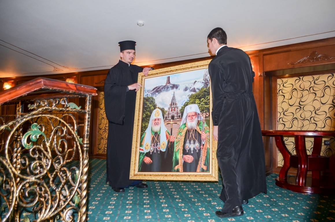Техни Светейшества Руският Патриарх Кирил и Българският Патриарх Неофит получиха оригинален подарък по време на официалния си обяд в Парк-Хотел "Стара Загора" на 3 март - за всеки по една картина с образите им на фона на шипченския храм "Рождество Христово" и паметника на връх Шипка.