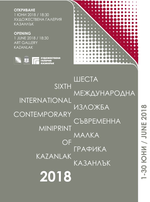 Шестата международна изложба СЪВРЕМЕННА МАЛКА ГРАФИКА – КАЗАНЛЪК 2018 ще бъде открита на 1 юни 2018 година /петък/ от 18,30 часа в залата за временни изложби на Художествена галерия – Казанлък и ще остане до 30 юни 2018 година.
