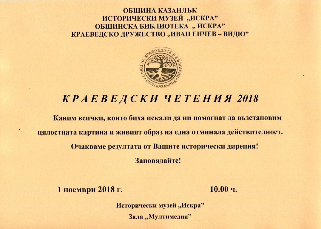 Община Казанлък, Исторически музей ,Искра“ , Общинска библиотека „Искра“ и Краеведско дружество „Иван Енчев- Видю“ Ви канят на :