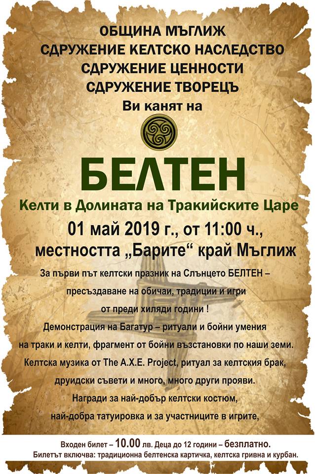 За първа година ще бъде проведен келтски празник на Слънцето БЕЛТЕН в долината на тракийските царе. Тържеството ще се състои утре, на 1 май от 11,00 часа в местността „Барите“ край Мъглиж. Съвкупност от обичаи, традиции и игри от преди хиляди години ще бъдат част от програмата.