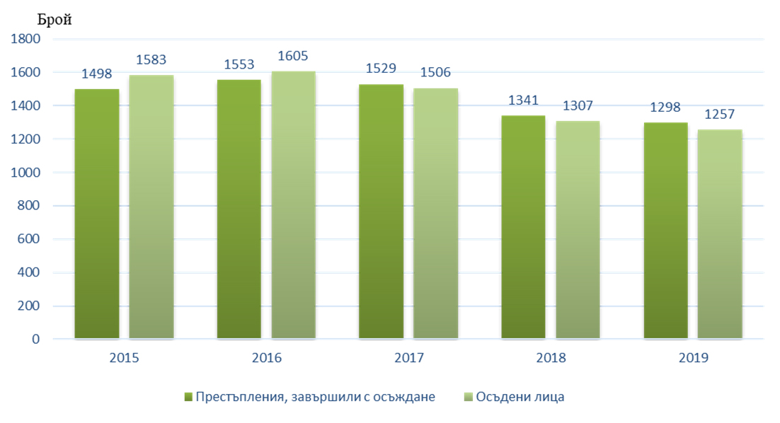 Броят на осъдените лица с влезли в сила присъди през 2019 г. е 1 257, като в сравнение с 2018 г. намалява с 3.8%.