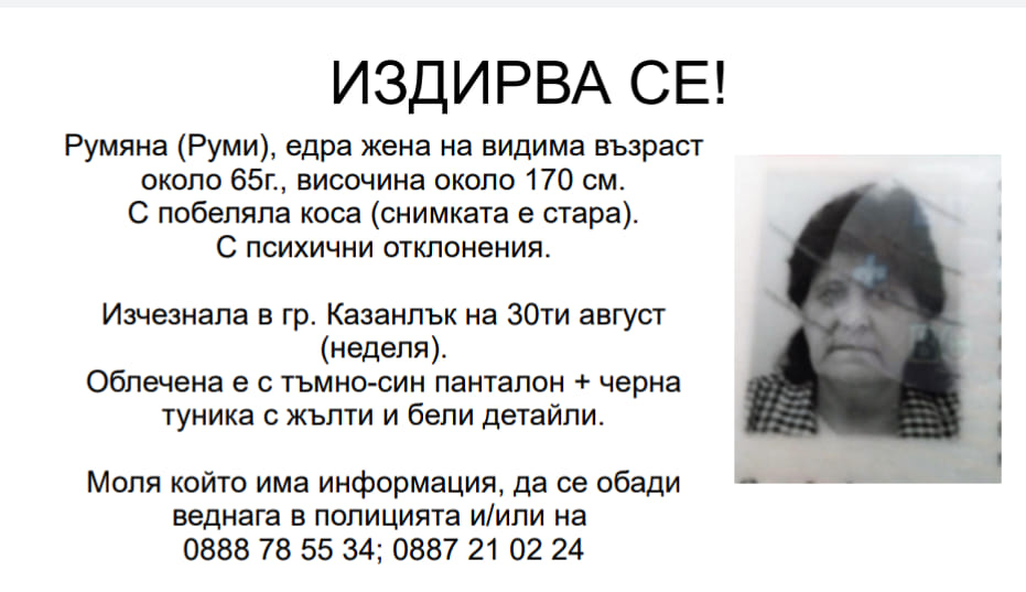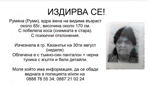 Издирва се изчезналата в неделя, 30-и август, казанлъчанка Румяна. Тя е едра жена на видима възраст около 65 години, висока около 170 см, с побеляла коса. Жената е с психични отклонения. (Снимката е стара)