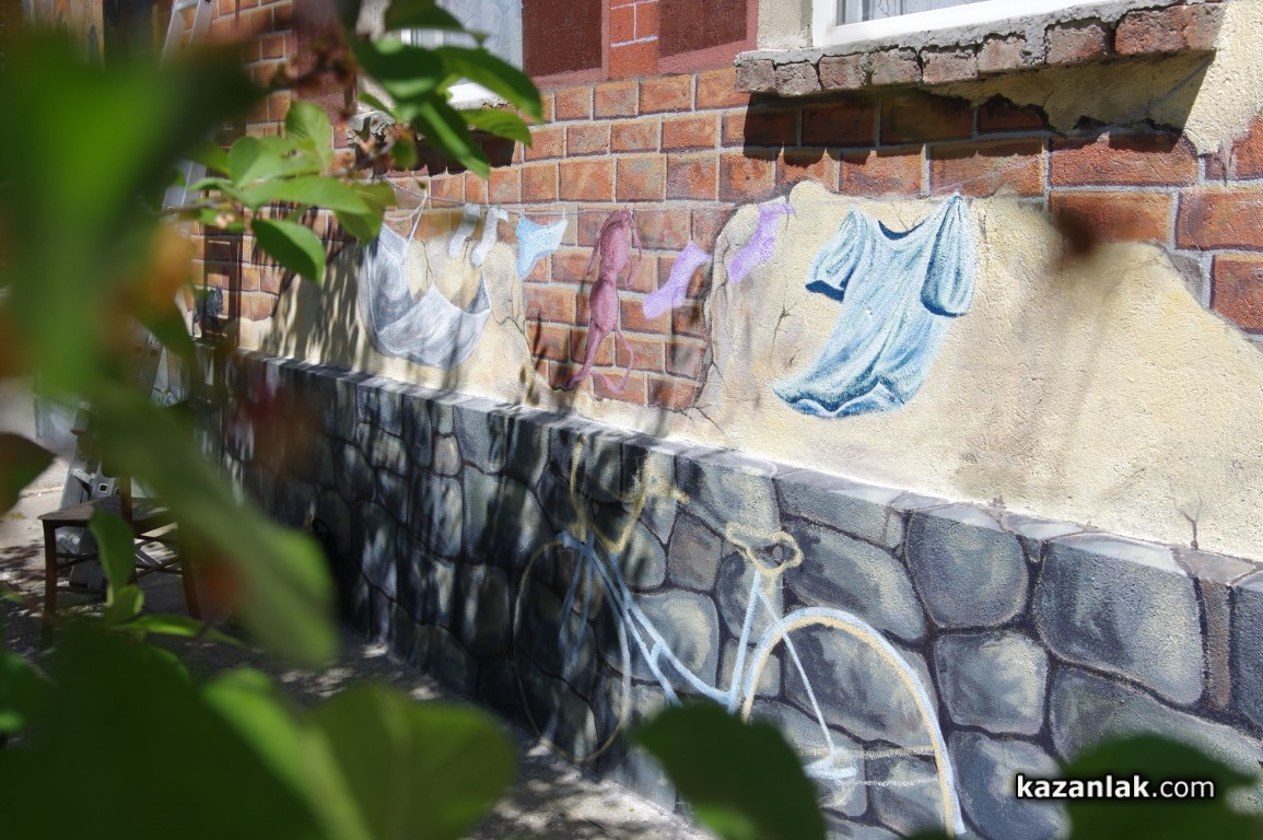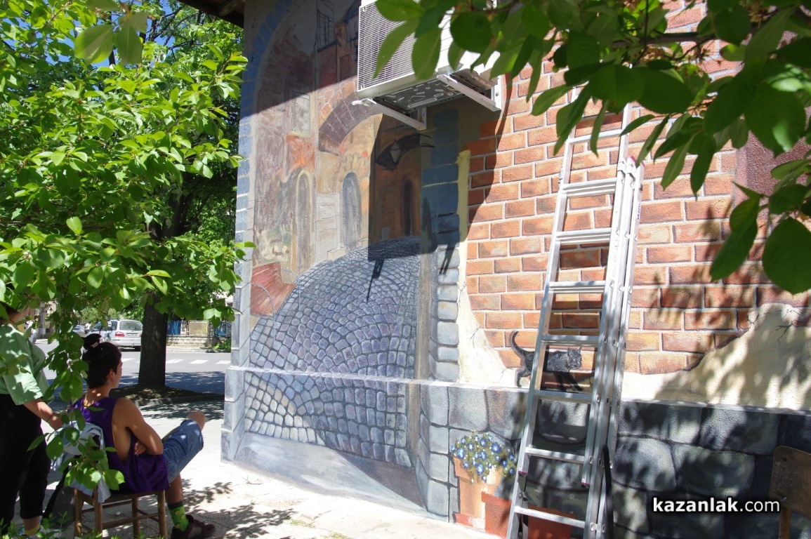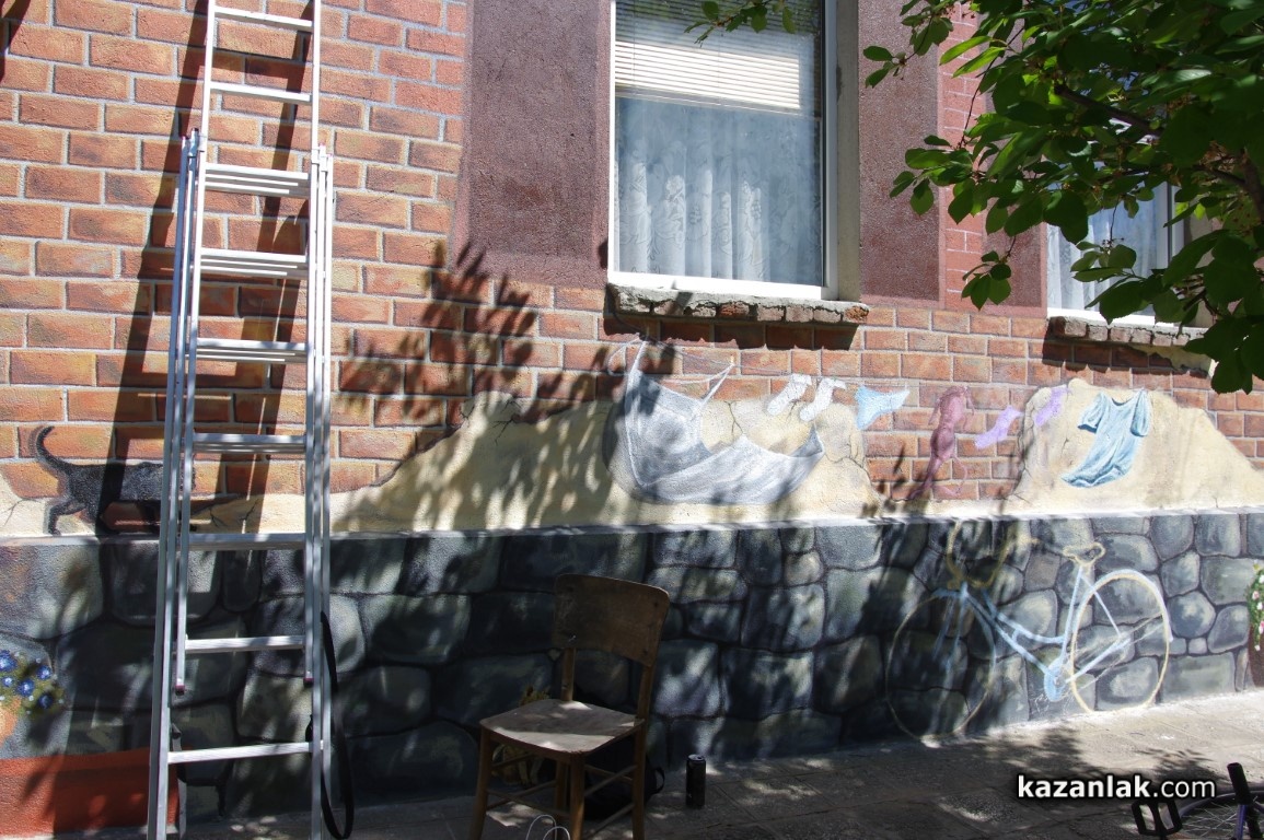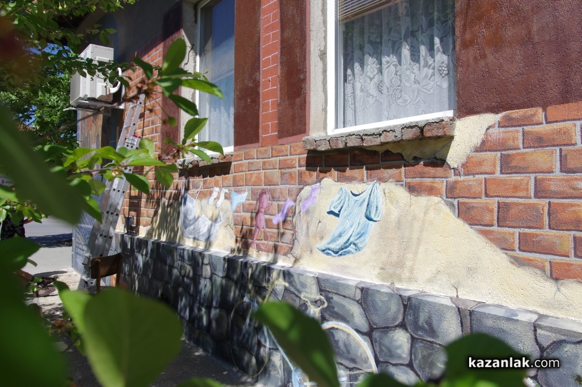 От няколко дни казанлъчани, минавайки по ул. „Стефан Караджа”, забелязват как една обикновена къща придобива нов, по-цветен облик. Западната фасада на къщата, намираща се на кръстовището по-известно като „петте кьошета”, срещу италианската пекарна „Джорджо”, заприлича на живописен пейзаж на малка италианска уличка.