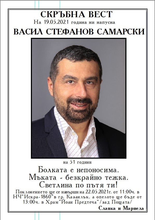 Тъжната вест оповести тази сутрин неговата сестра Славка Самарска в социалните мрежи. Васил Самарски не е успял да се пребори с коварния вирус, върлуващ в целия свят - Covid-19. Преди няколко седмици е постъпил в казанлъшката болница, но след влошаване е бил откаран във ВМА, София.